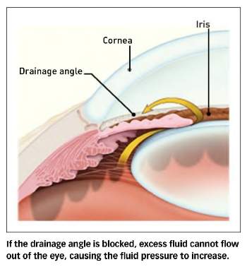 Because the eye is a closed structure, if the drainage area for the aqueous humor — called the drainage angle — is blocked, the excess fluid cannot flow out of the eye. Fluid pressure within the eye increases, pushing against the optic nerve and causing damage.